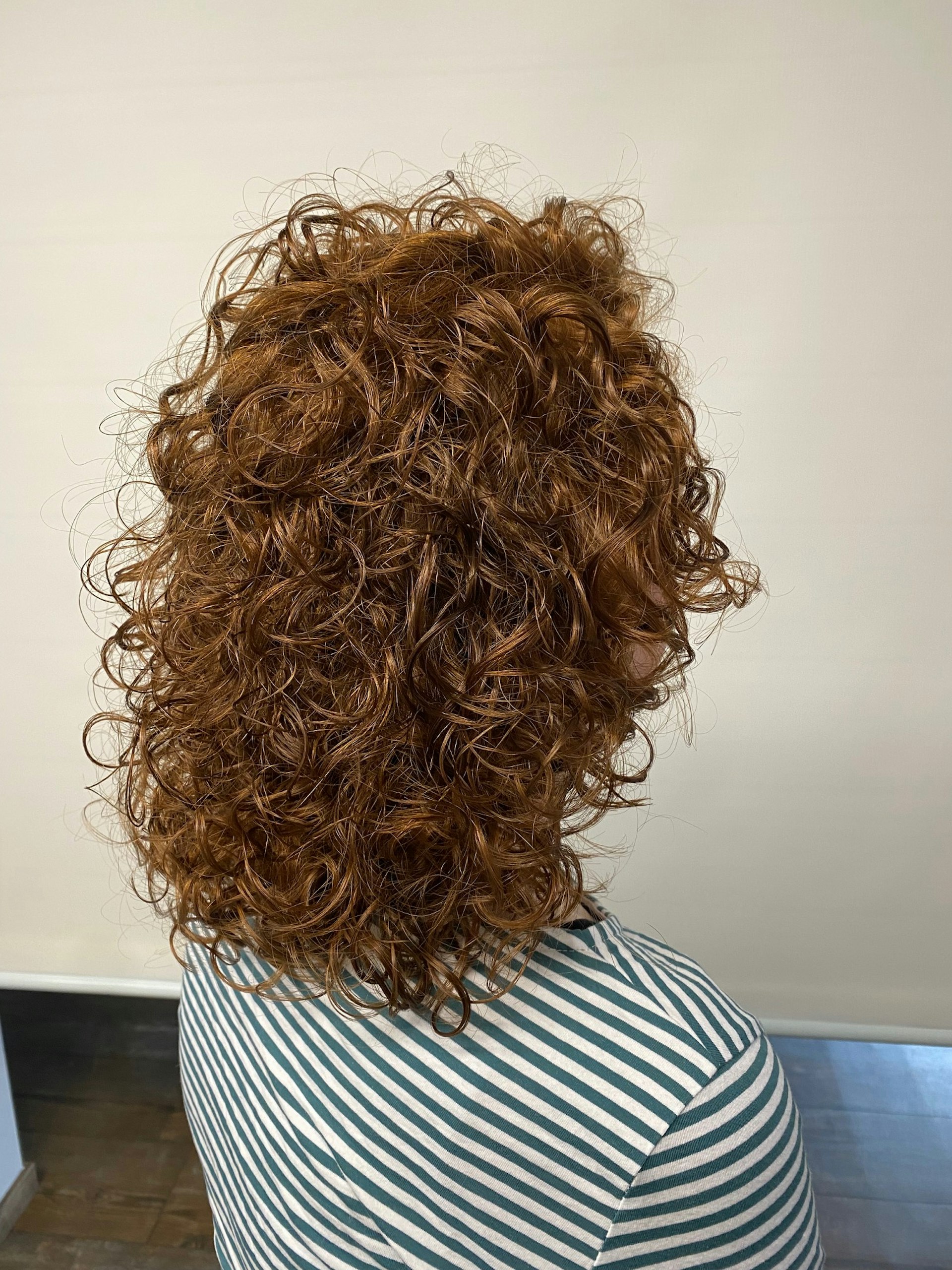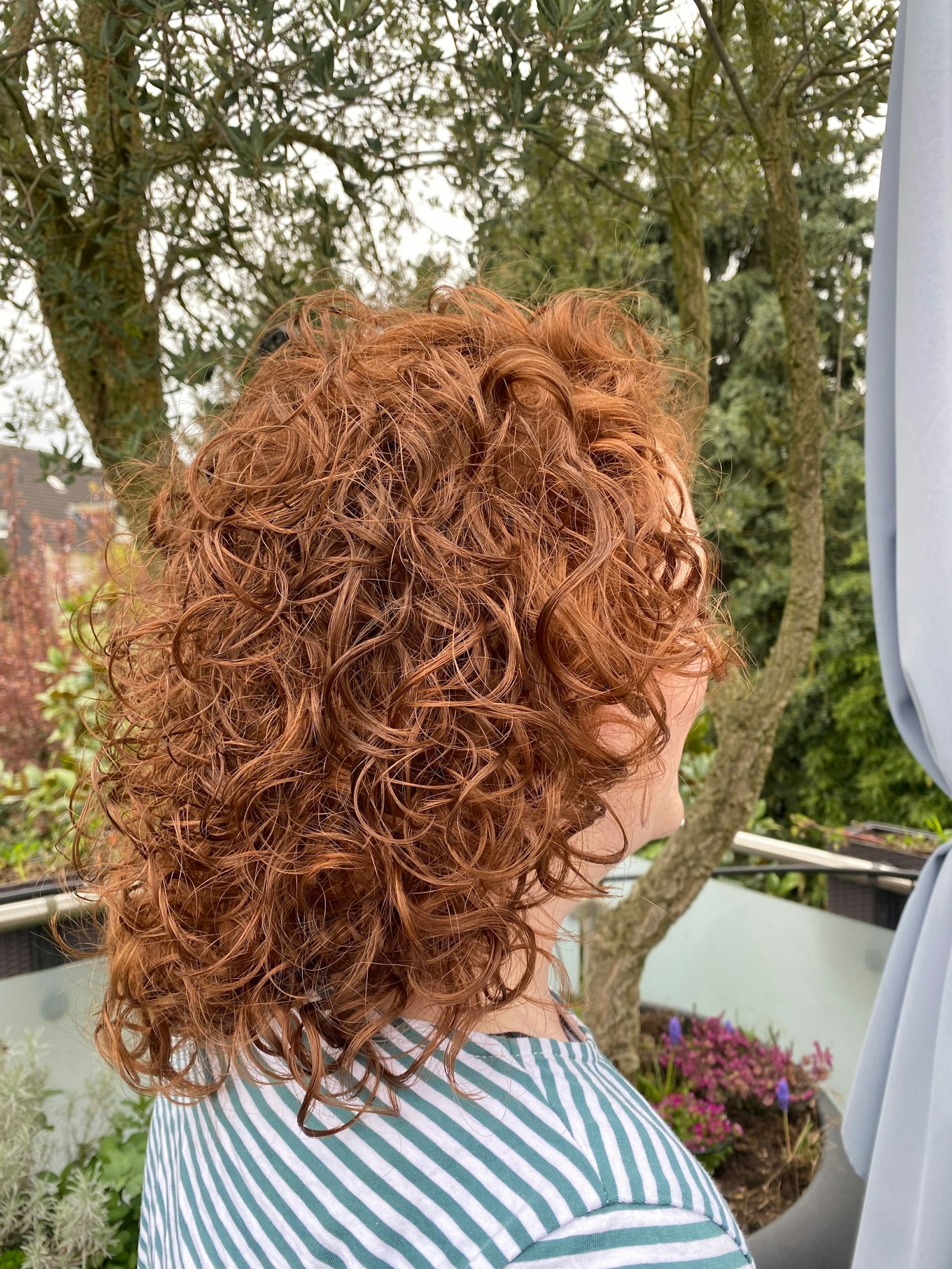 Hier haben wir aus einem Dunkelblond mit einem schönen Kupferrot 8.43 (hellblond Kupfer) und einem kräftigen Entwickler die Haare 2-3 Töne aufgehellt und ihm einen sehr schönen kupferroten Ton verliehen.
